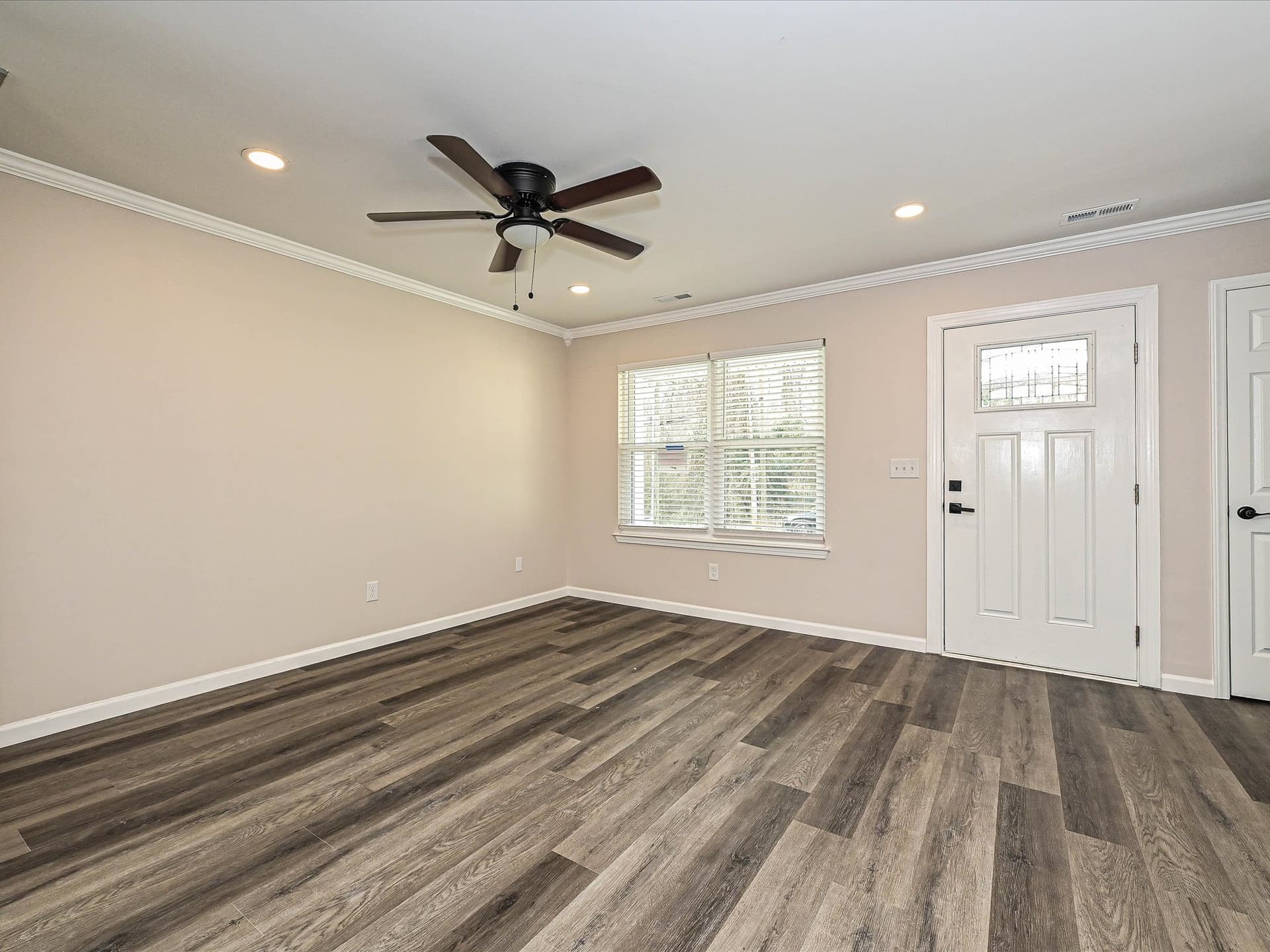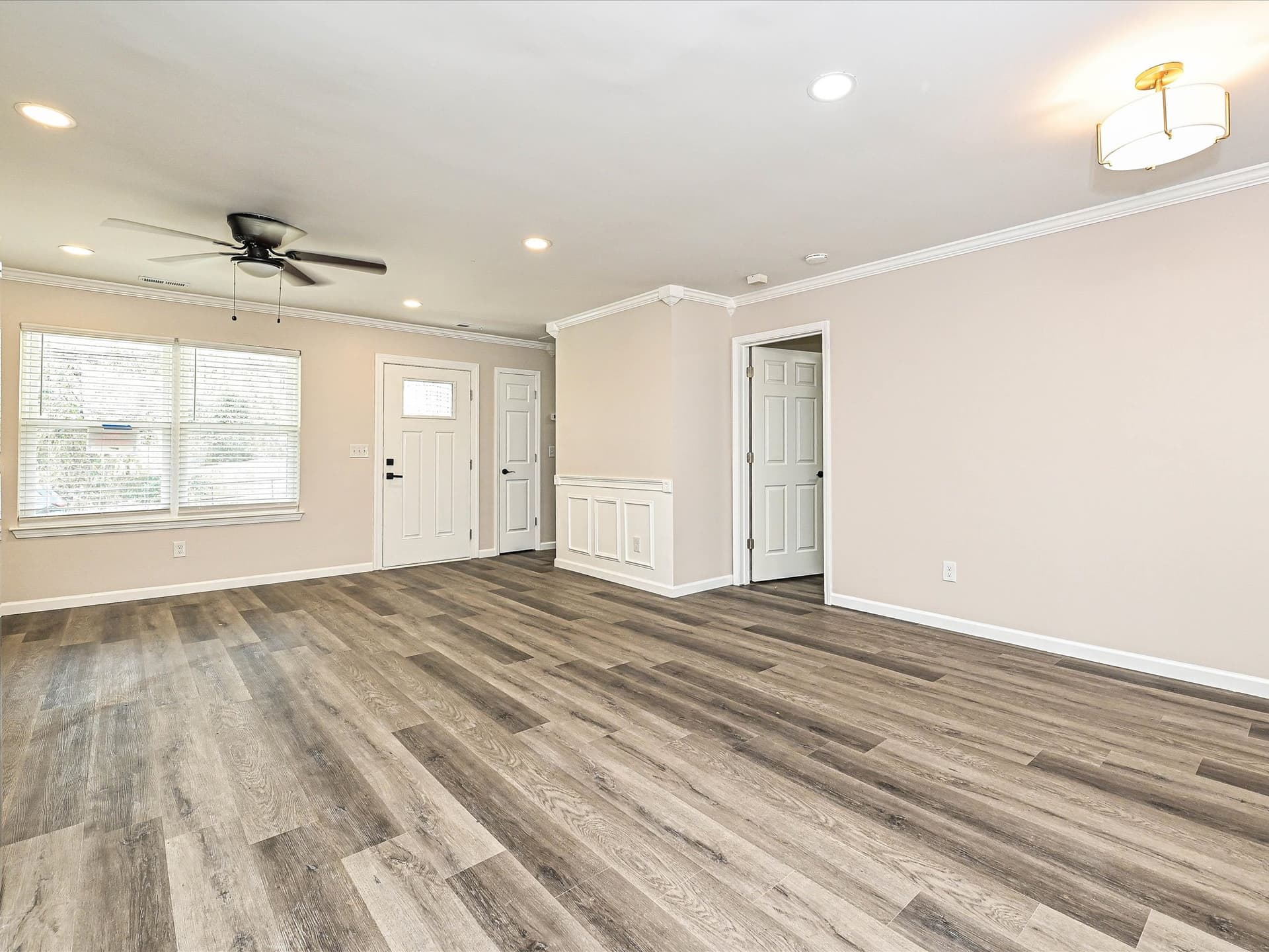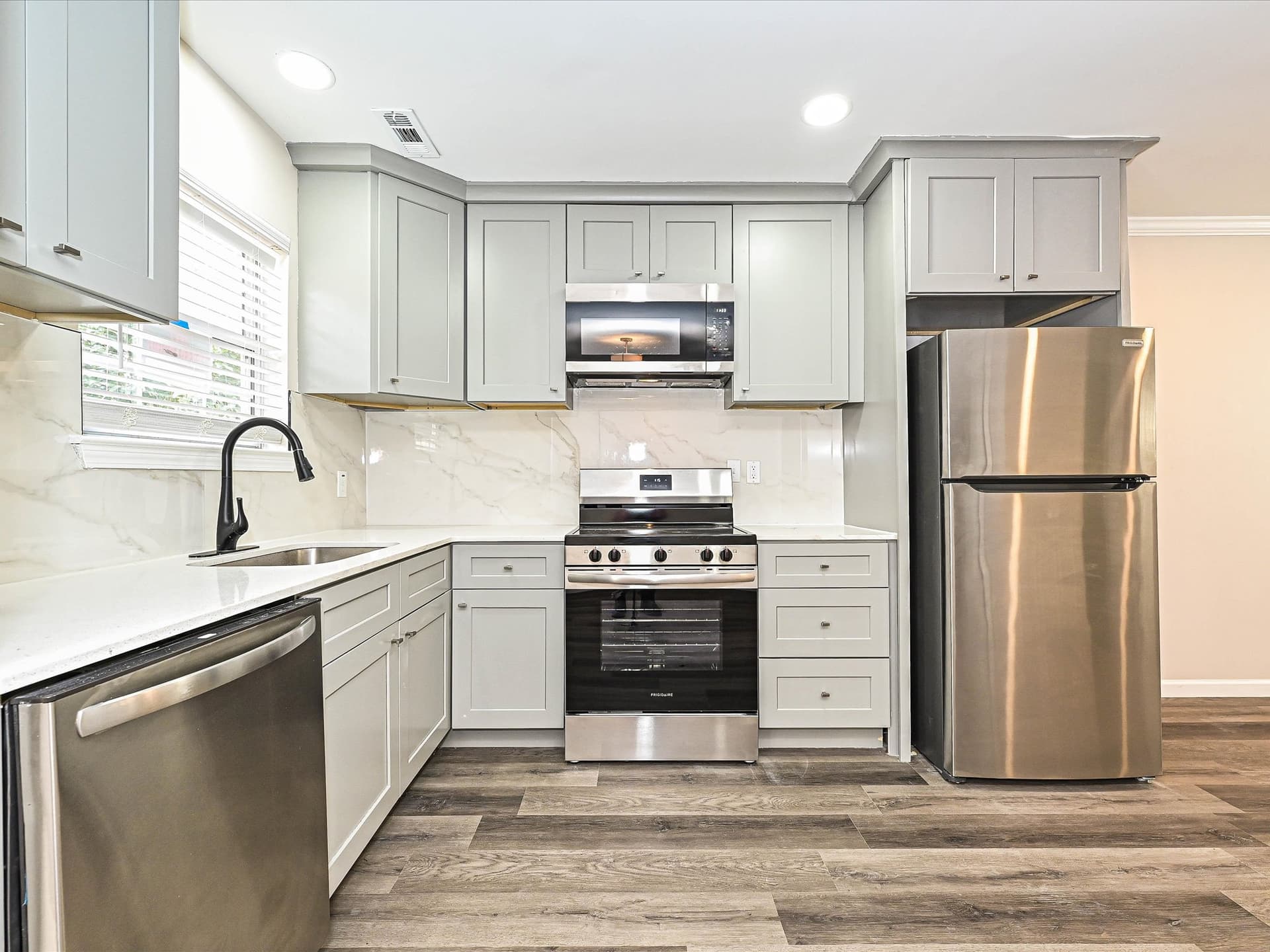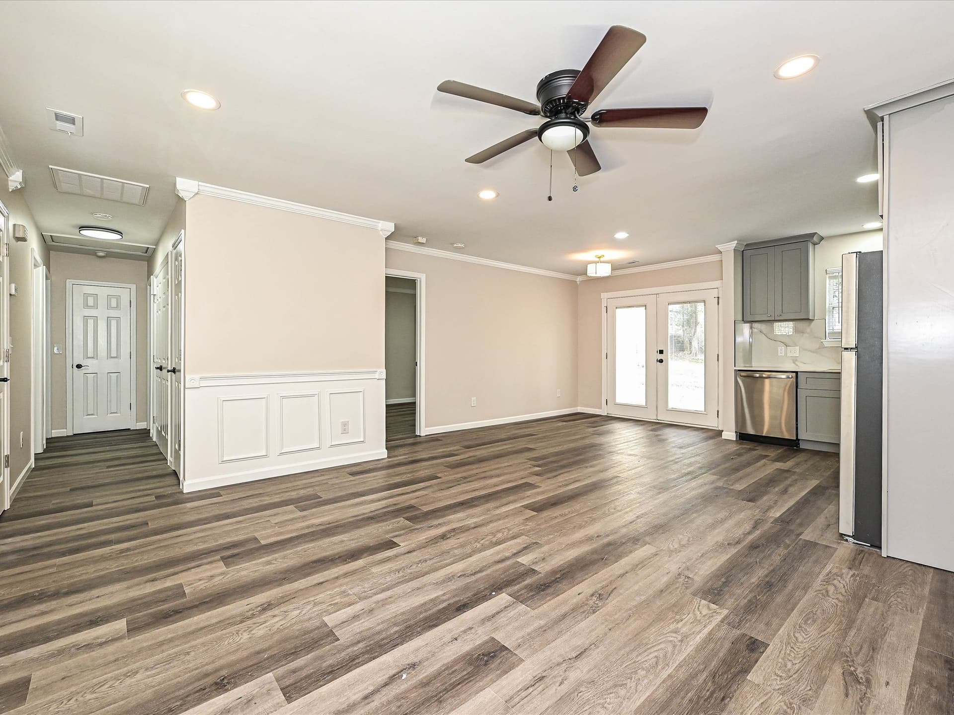 Inside, the home features fresh updates throughout, including pearl‑gray cabinets, granite‑white countertops, new brown vinyl flooring, elegant crown molding, and bright natural light across the open‑concept main living area. The layout feels warm and welcoming, with comfortable spaces for relaxing or gathering.