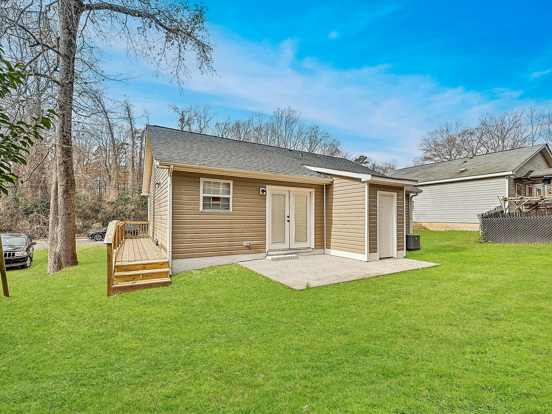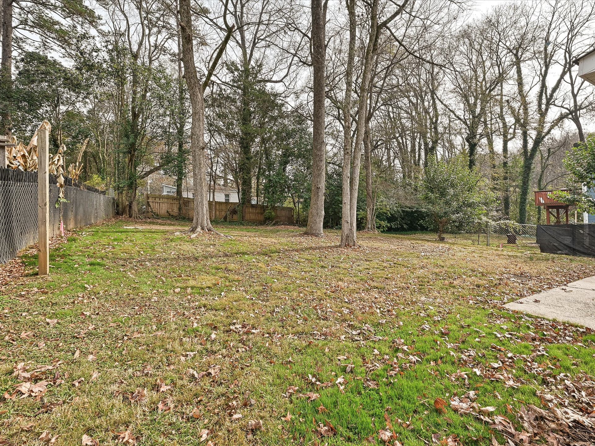 Mature trees surround the property, and the extended back porch overlooks a shaded, private yard—creating a calm outdoor space that feels tucked away from the city.