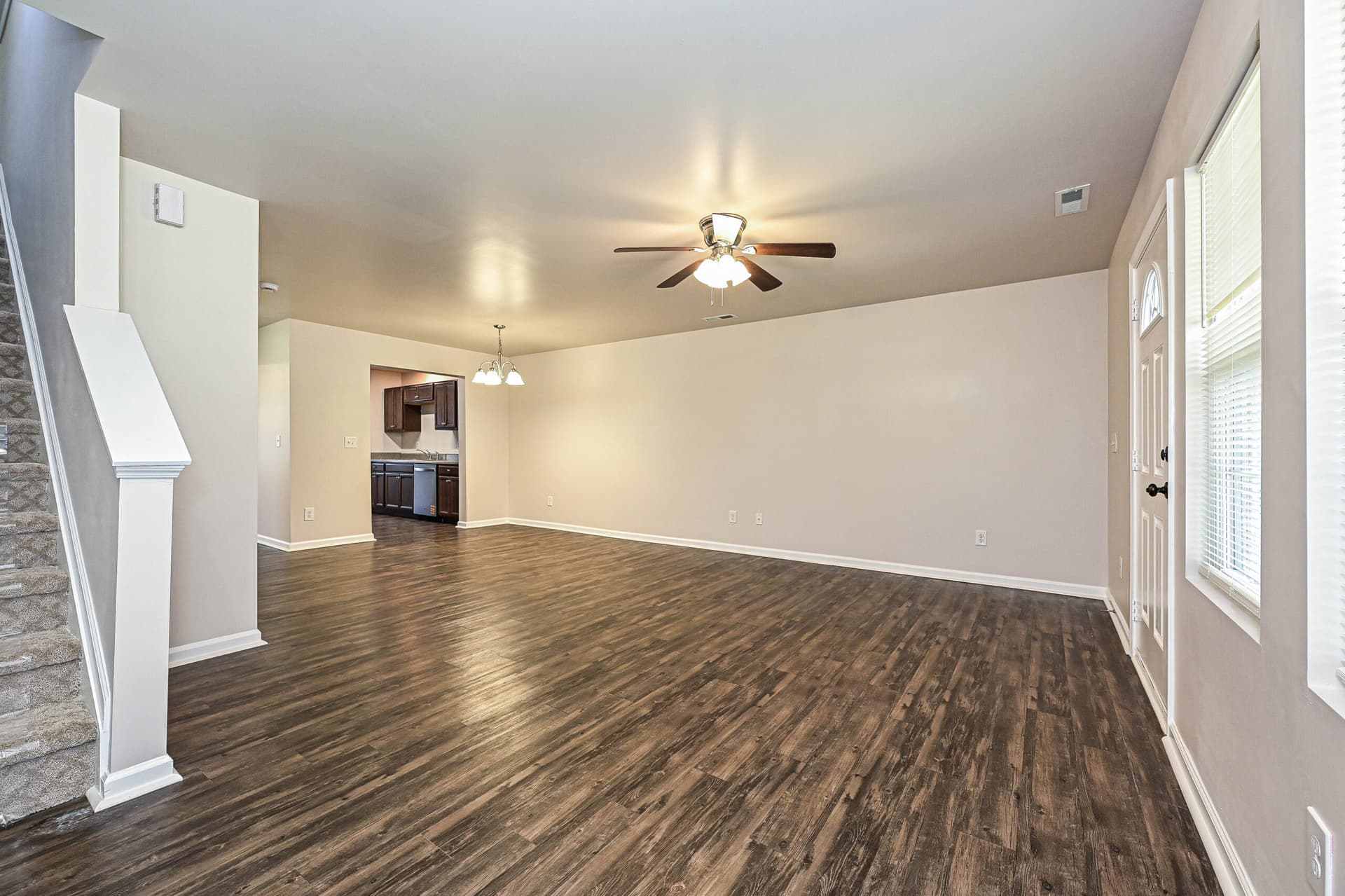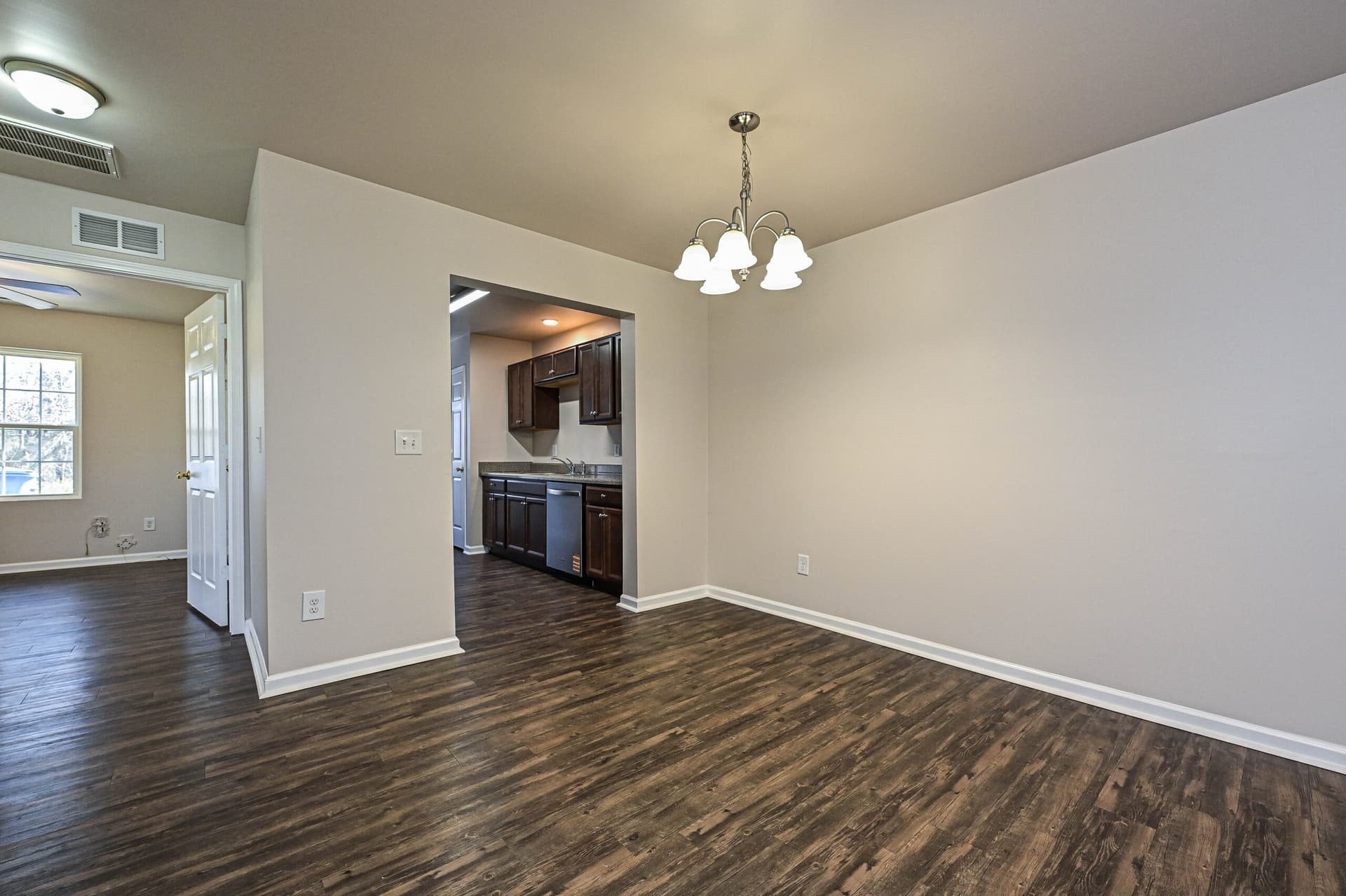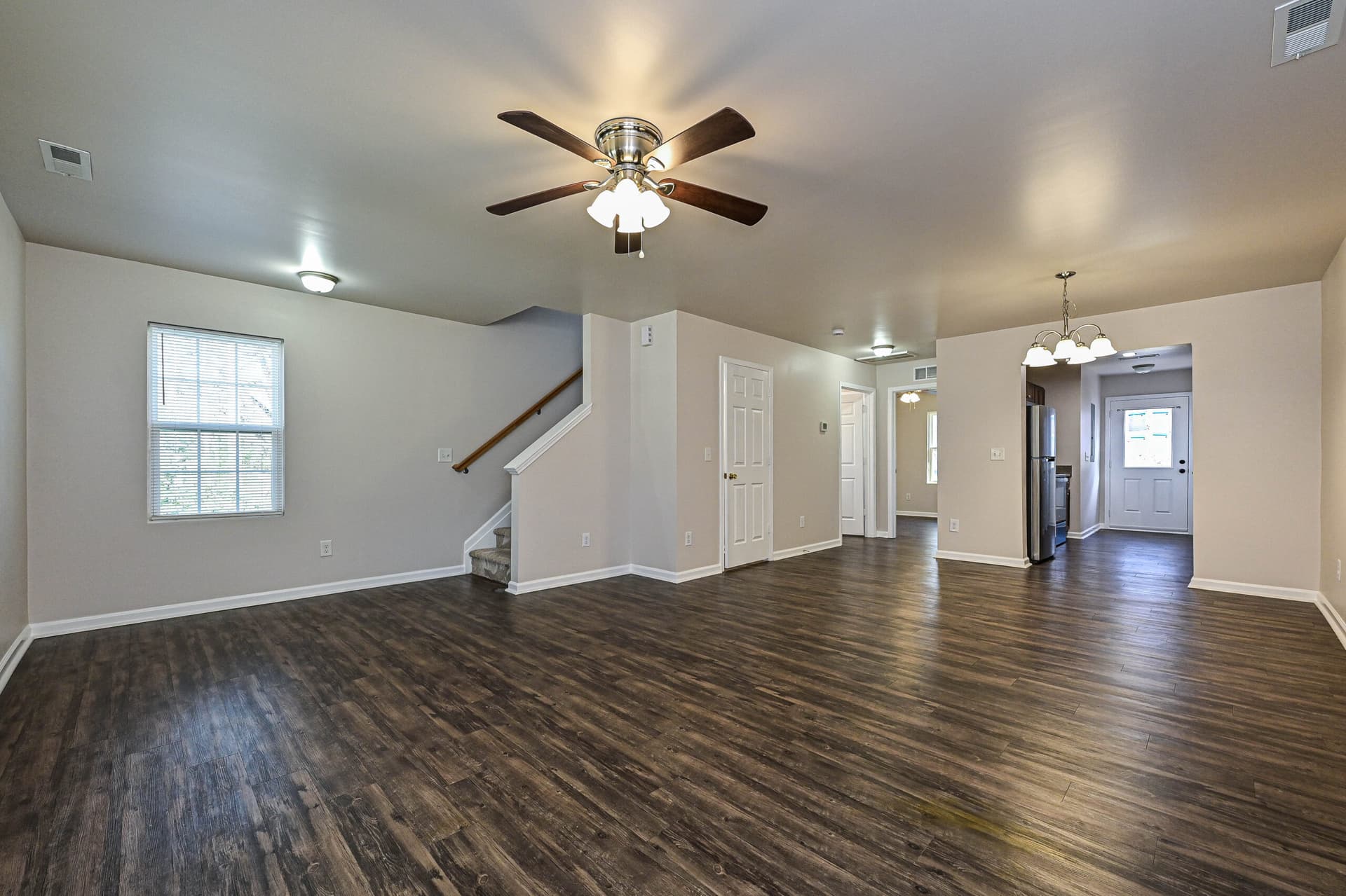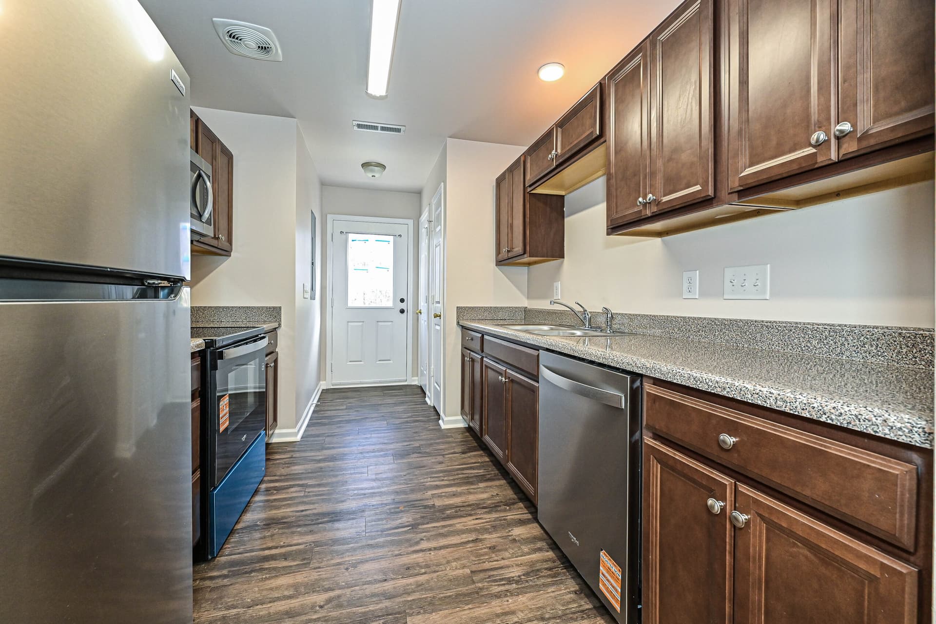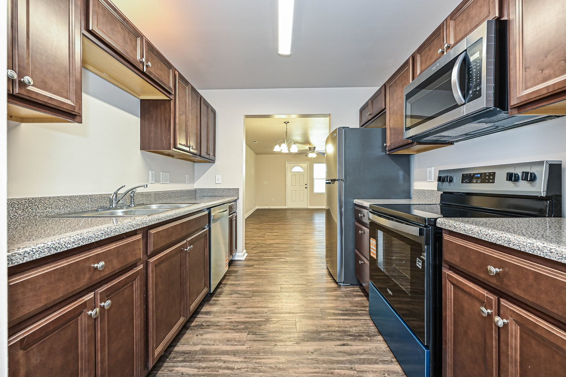 Inside, the home features a bright, open layout with hard surface vinyl flooring throughout, a kitchen with new stainless-steel appliances, and rich dark brown cabinetry that adds warmth and depth to the space.