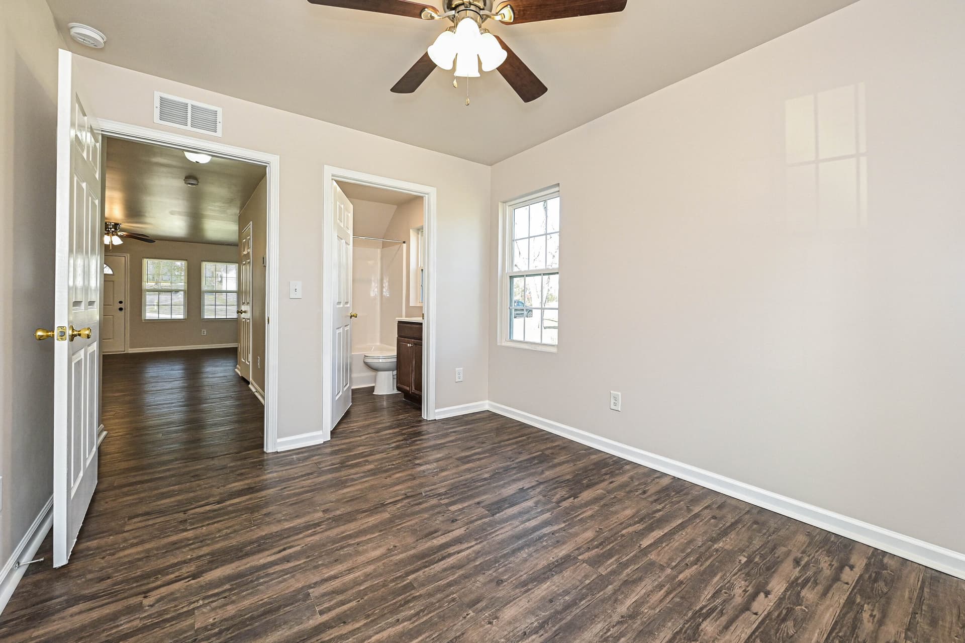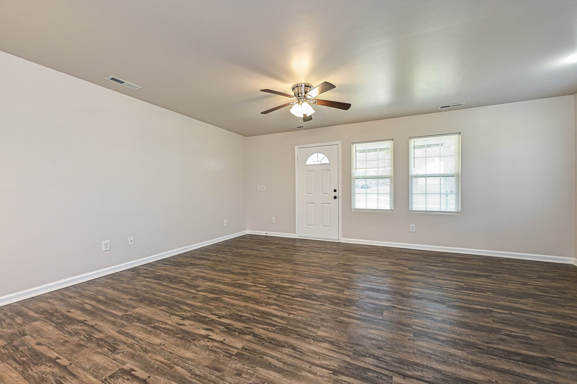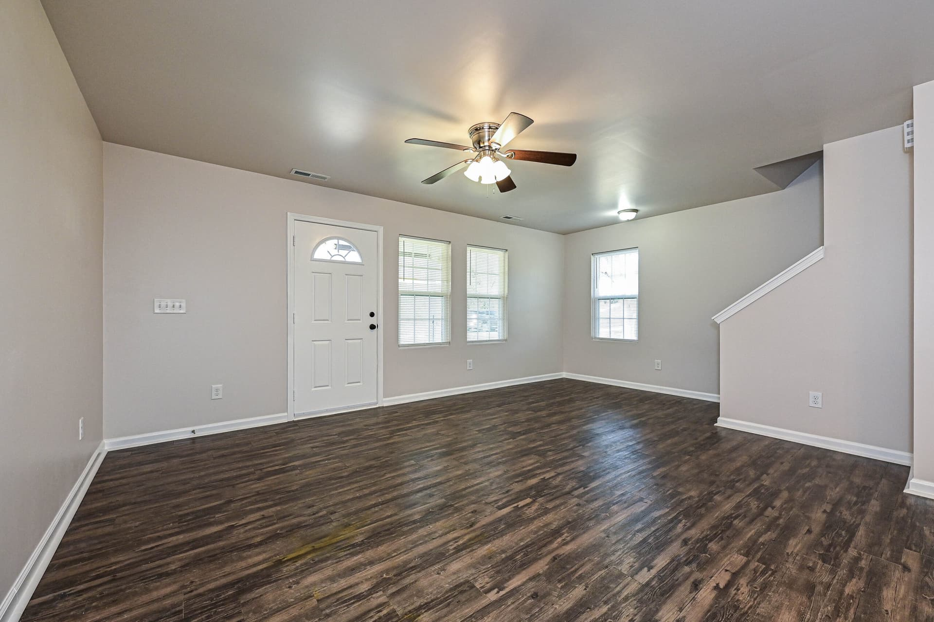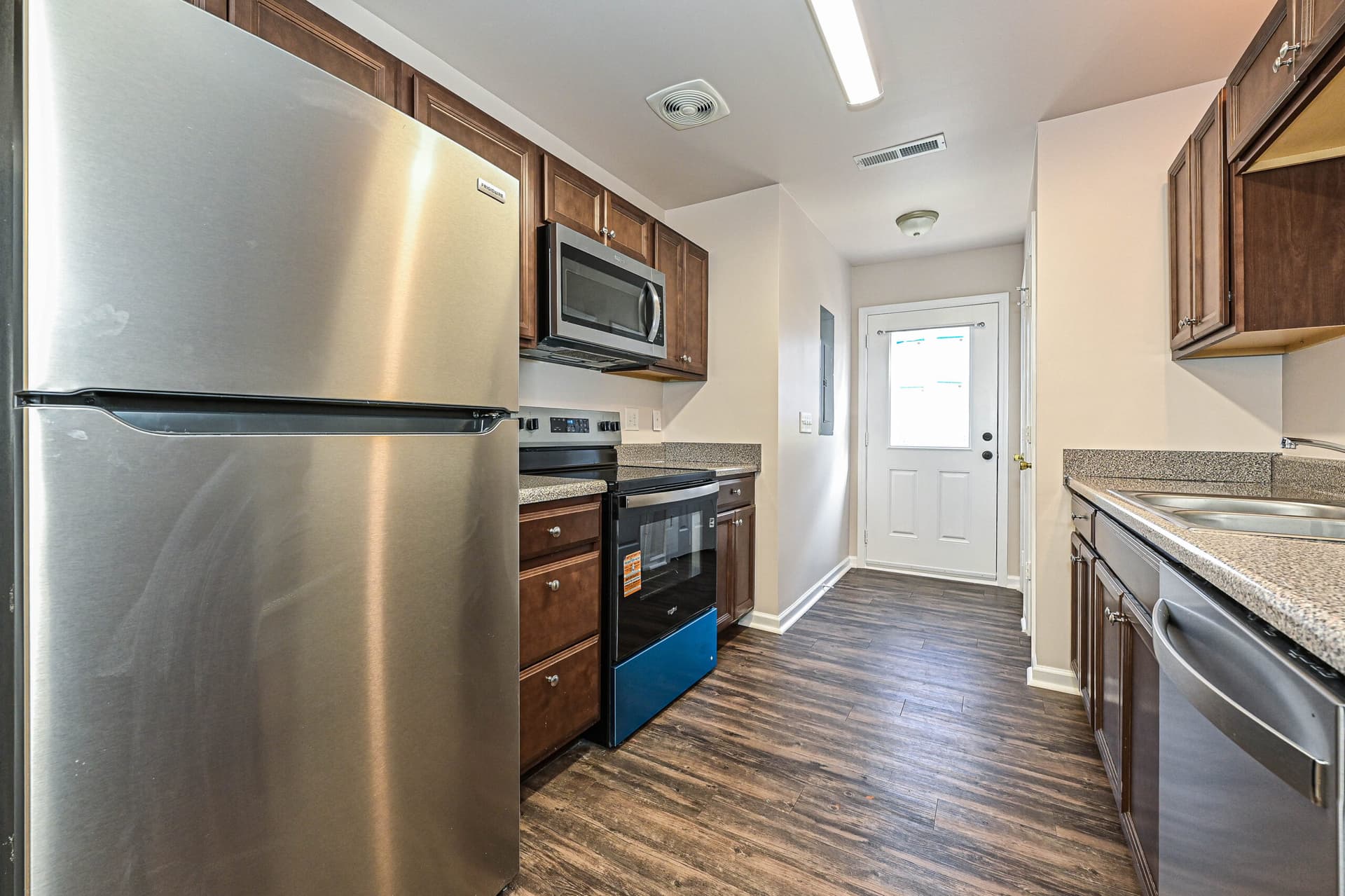 Inside, the home features a bright, open layout with hard surface vinyl flooring throughout, a kitchen with new stainless-steel appliances, and rich dark brown cabinetry that adds warmth and depth to the space.